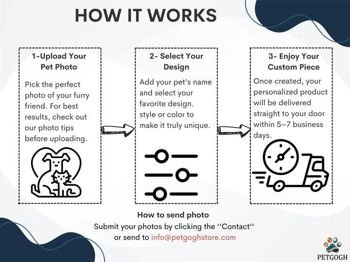 Send Your Photo: After ordering, click "Contact Shop" or "Message Seller" to send us your pet's photo or Send us your pets' photo by email at info@petgoghstore.com with your Etsy Order Number.