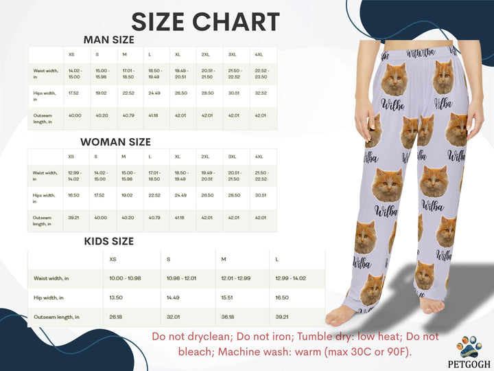 To keep your custom pajamas looking their best, machine wash cold with like colors. Do not bleach. Tumble dry on low heat or hang to dry. Do not iron directly over the print.