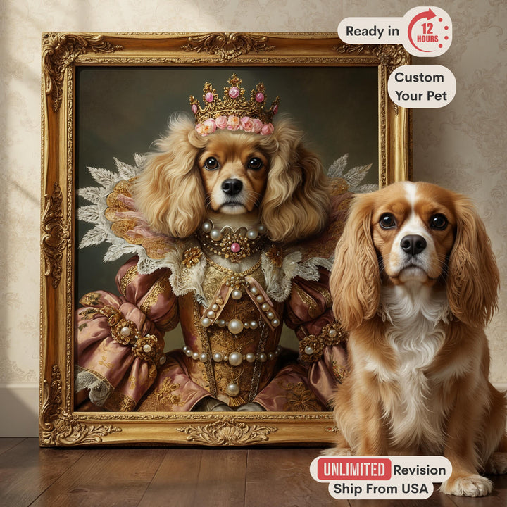 Turn your favorite dog or cat photo into a timeless royal masterpiece with a Custom Pet Portrait from PetGogh. We celebrate the true ruler of your home by portraying your pet as a graceful Queen in a stunning, classic costume. This personalized oil painting style canvas is the perfect piece of regal dog art or cat art, capturing the elegant and funny spirit of your pet in a way that is guaranteed to be a conversation starter.