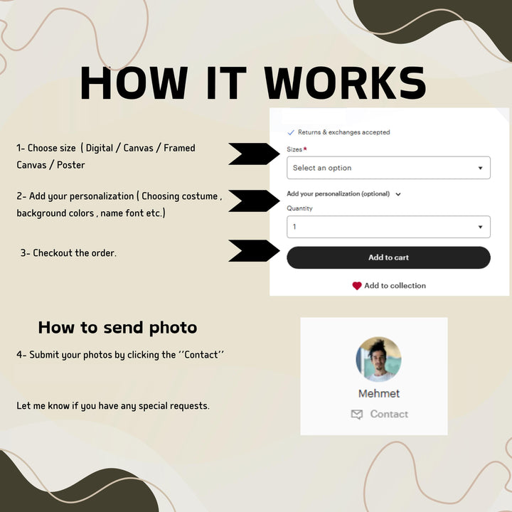 Send Your Photo: After placing your order, click on "Contact Shop" and attach your pet's photo.