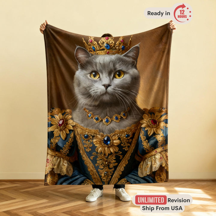 Royal Pet Blanket, Custom Dog Portrait Throw, Personalized Cat Painting, Regal Pet Gift